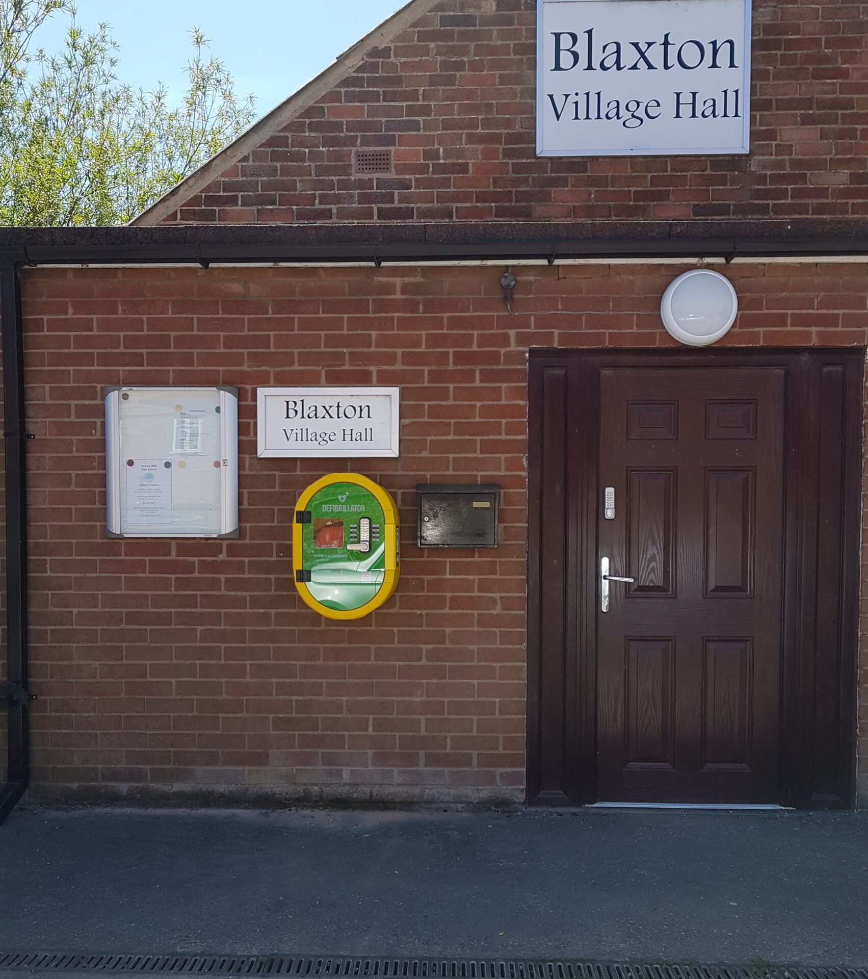 The defibrillator is located outside Blaxton Village Hall, Back Lane, Blaxton, Doncaster, DN9 3AJ