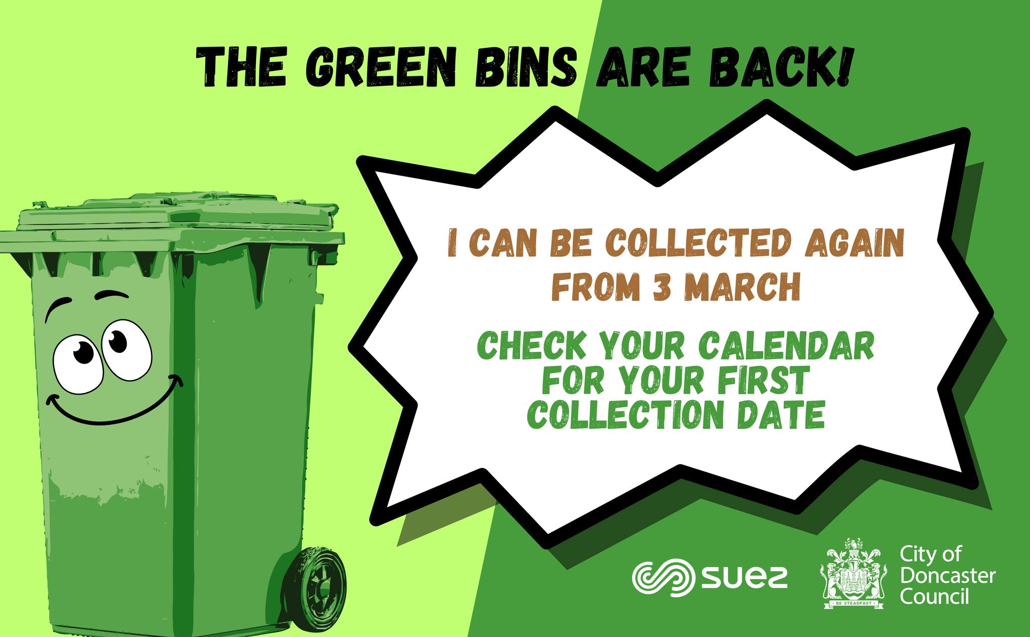 Starting from Tuesday 3 March, Green Bin collections are returning to Doncaster - don’t forget to check your calendar to see when your collection date is.